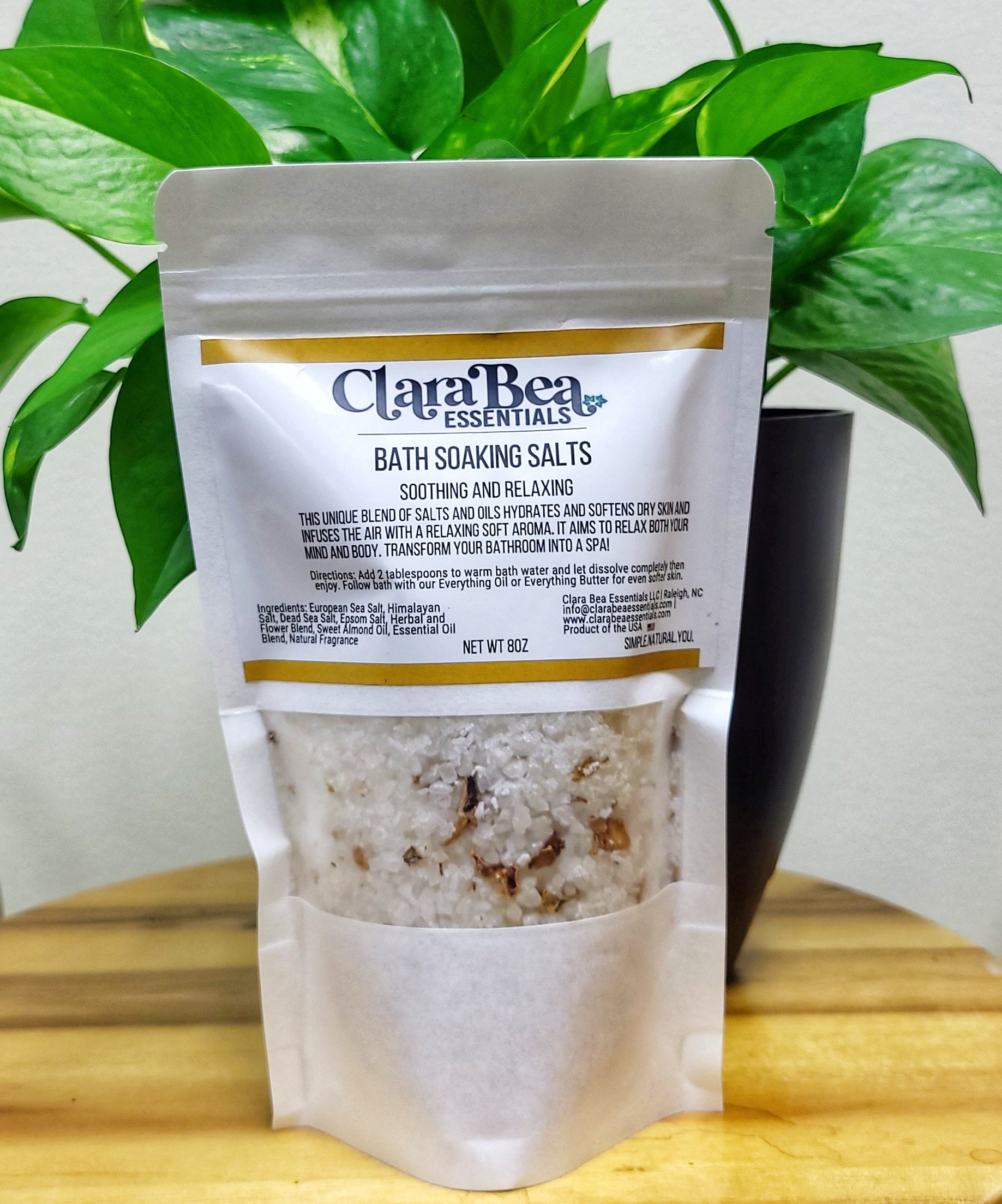 Ingredients: European Sea Salt, Himalayan Salt, Dead Sea Salt, Epsom Salt, Herbal Tea Blend, Sweet Almond Oil, Essential Oil Blend, Natural Fragrance